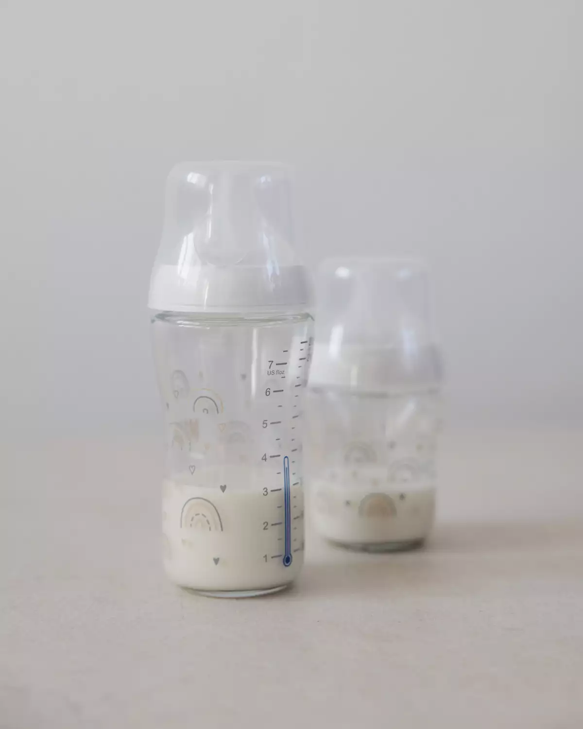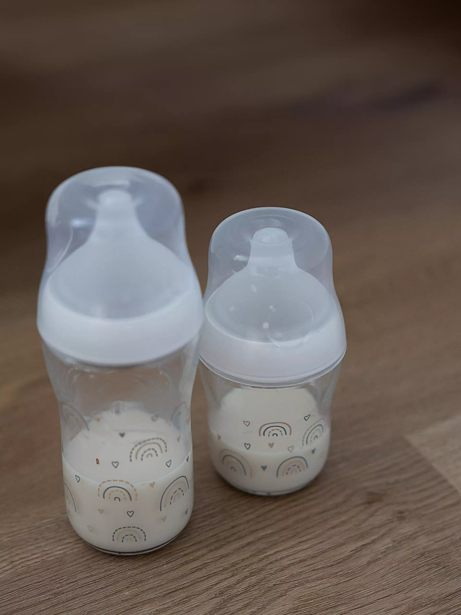 Gerade zu Beginn fällt es Eltern oft schwer, einzuschätzen, ob die Milch noch zu heiß für ihr Baby ist. Um sicherzugehen, kannst du ein spezielles Thermometer verwenden. Falls du keines da hast, gib einfach ein paar Tropfen von der Milch auf die Innenseite deines Handgelenks. Bei der richtigen Temperatur ist das kaum spürbar und sollte sich weder heiß noch kalt anfühlen. Und keine Sorge: Mit der Zeit entwickelst du ein Gefühl für die passende Temperatur.