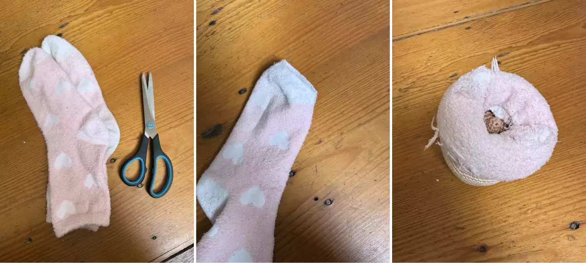 - Schnapp dir ein altes Paar dicke Socken, schneide die Spitzen der Zehenpartie ab und rolle sie zu einem Ring auf.
