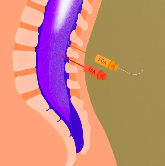 PDA ist die Abkürzung für Periduralanästhesie. Darunter verstehen wir eine rückenmarksnahe Betäubung. Das heißt, es wird ein ganz kleiner, feiner und dünner Schlauch auf Lendenwirbelsäulen-Niveau in den Rücken eingebracht, über den einmalig oder über längere Zeit lokale Schmerzmittel gegeben werden können. Was dann bei vollerhaltenem Bewusstsein zu einer Schmerzreduktion führt. Optimalerweise kann man sich dabei auch nach wie vor noch bewegen und bekommt alles mit, aber hat eine Linderung des Wehenschmerzes.